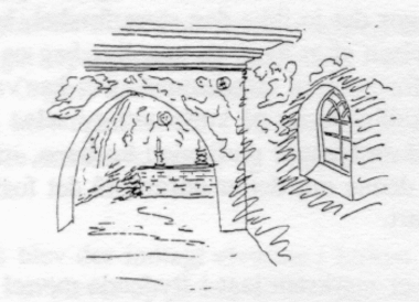 I stedet for korbuen er der nu en mur, og et par meter foran den er triumfvæggen med triumfbuen, formentlig flankeret af mindre buer til sidealtrene. Lys får vi fra de to vinduer i sydsiden, - det østligste og det vestligste.