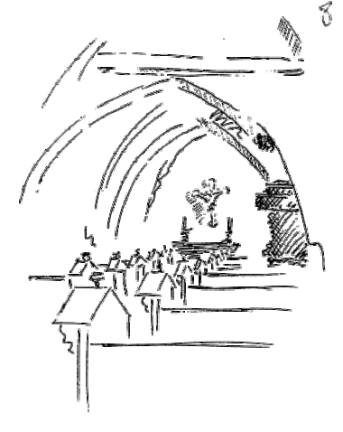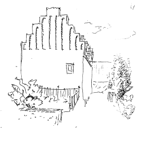 Murhøjden var den samme, men taget havde mindre hældning og var rejst med en lettere konstruktion, fordi det ikke var teglhængt som nu, men måske var tækket med bly eller snarere med træspån, som man ser på gamle vindmøller. Måske endda stråtækt, - hvem ved.