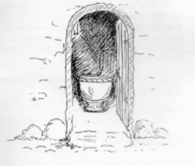 Vest for det vindue og lige over for døren i nordsiden sidder syddøren, den mændene benyttede, mens kvinderne var henvist til den kolde nordside. Trappestenen kan anes endnu.