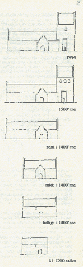 Omkring år 1500 er tårnet væk, - vi har et langhus med kamtakket øst- og vestgavl. I løbet af 1400'rne forsvinder koret, - de østligste syv meter og med dem det østligste vindue, så vi står med et langhus med to vinduer, - et ved østgavlen og et ved vestgavlen.